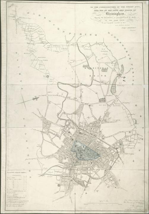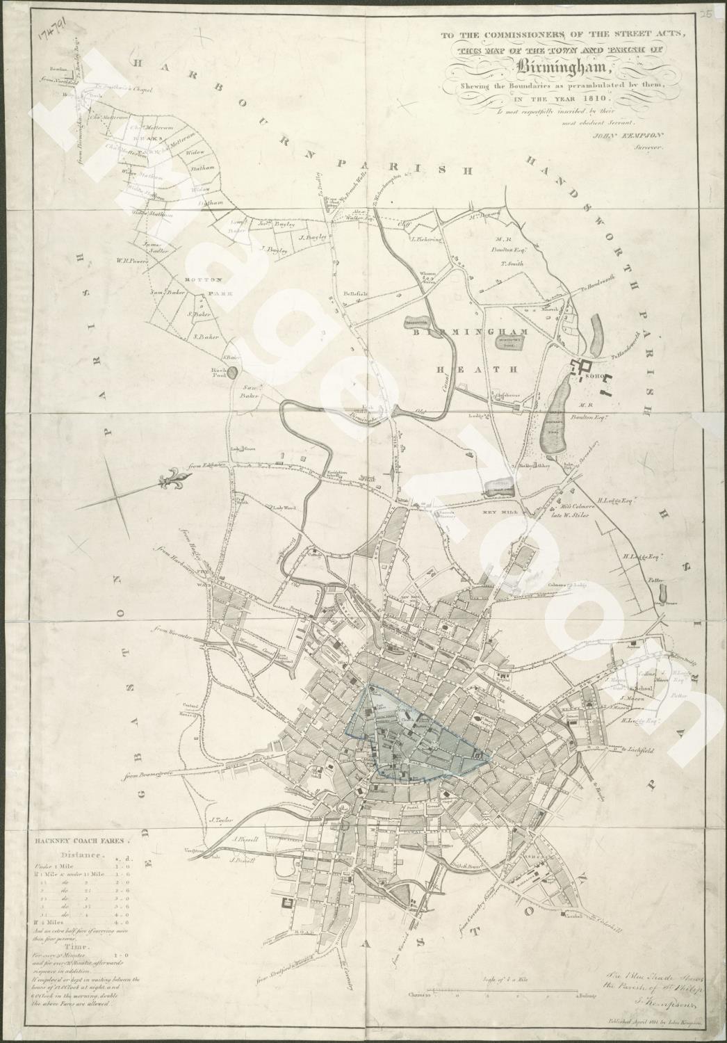 TO THE COMMISIONERS OF THE STREET ACTS, THIS MAP OF THE TOWN AND PARISH OF Birmingham, shewing the Boundaries as perambulated by them, IN THE YEAR 1810, Is most respectfully inscribed by their most obedient Servant JOHN KEMPSON Surveyor.