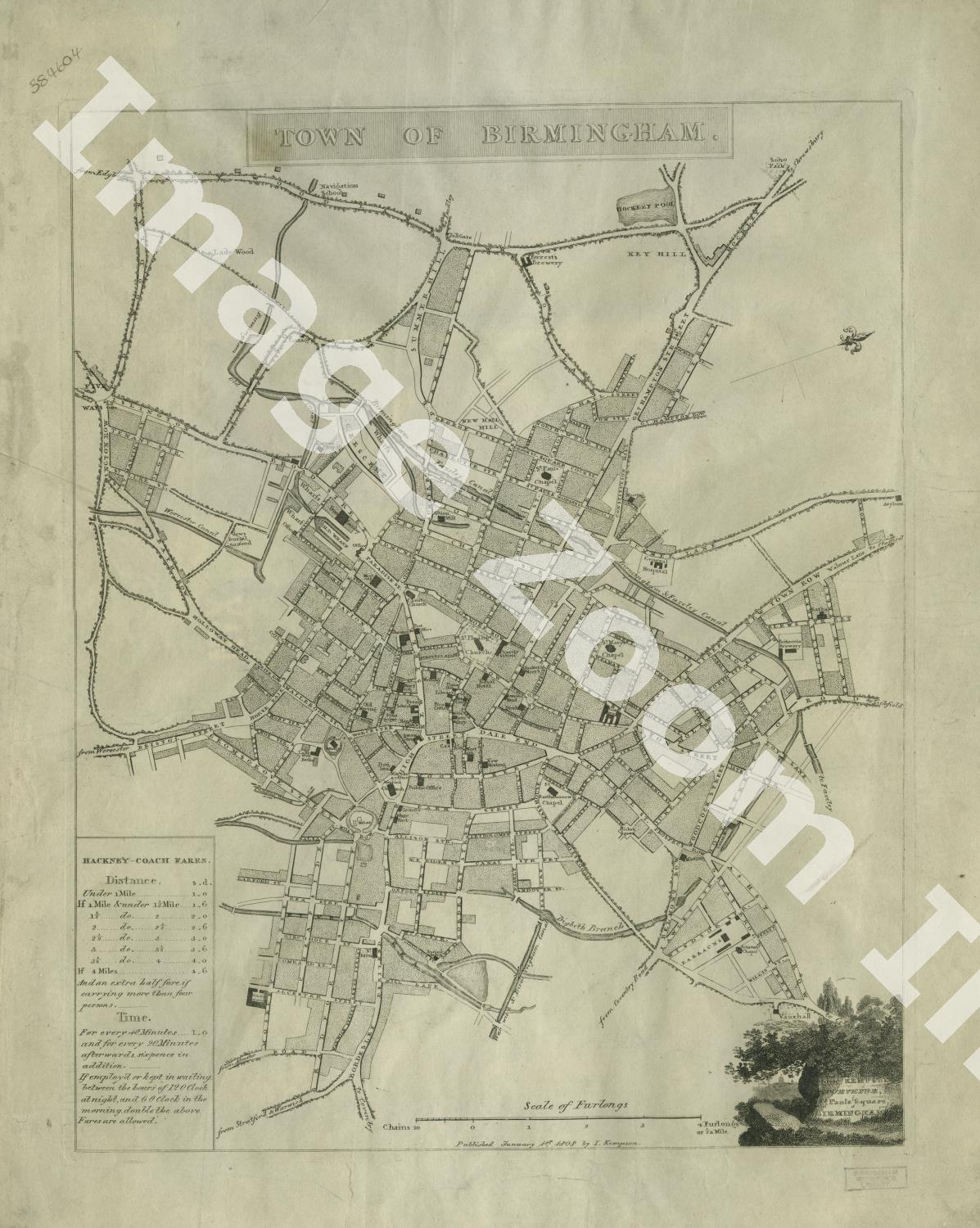 At the bottom left is a table of hackney carriage fares. Along the base of the map is printed, ‘Published January 1st 1808 by J. Kempson.’ and the cartouche in the bottom right states’John Kempson, surveyor, St Paul’s Square, Birmingham.